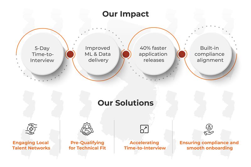 Organizations across the New Jersey innovation corridor face sustained pressure to secure highly specialized technical talent. Data scientists, Machine Learning Engineers, and Full-Stack Developers with domain-specific experience remain in high demand. Internal recruiting teams often encounter prolonged hiring cycles due to limited regional pipelines, competitive markets, and regulatory considerations. Late-stage candidate withdrawals, frequently tied to commute or location constraints, further extend timelines and stall critical projects.